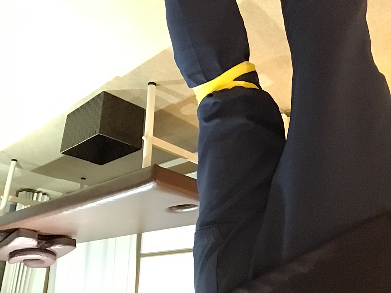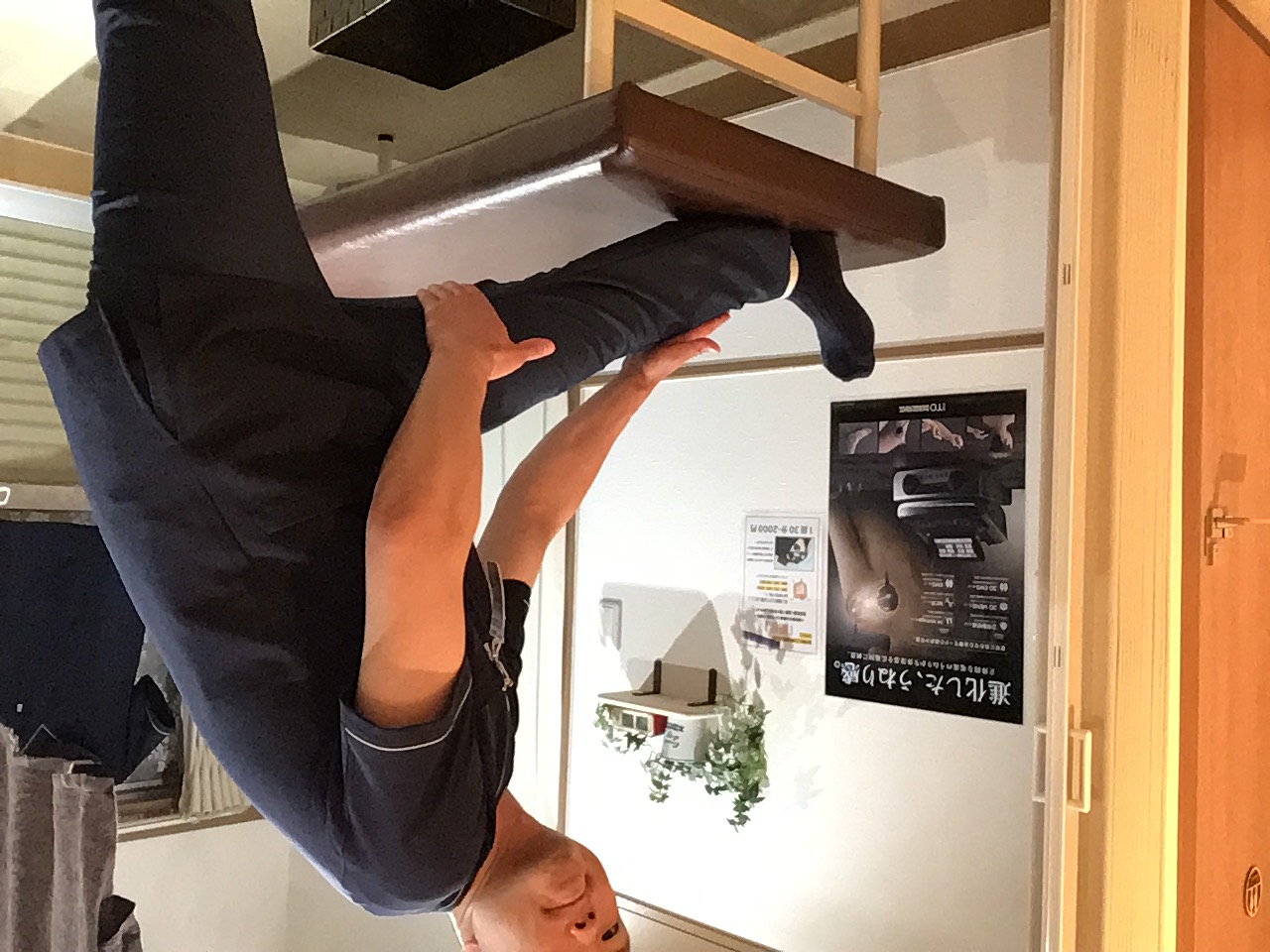 1. 椅子に座ったまま、右足を左ももにのせます。
