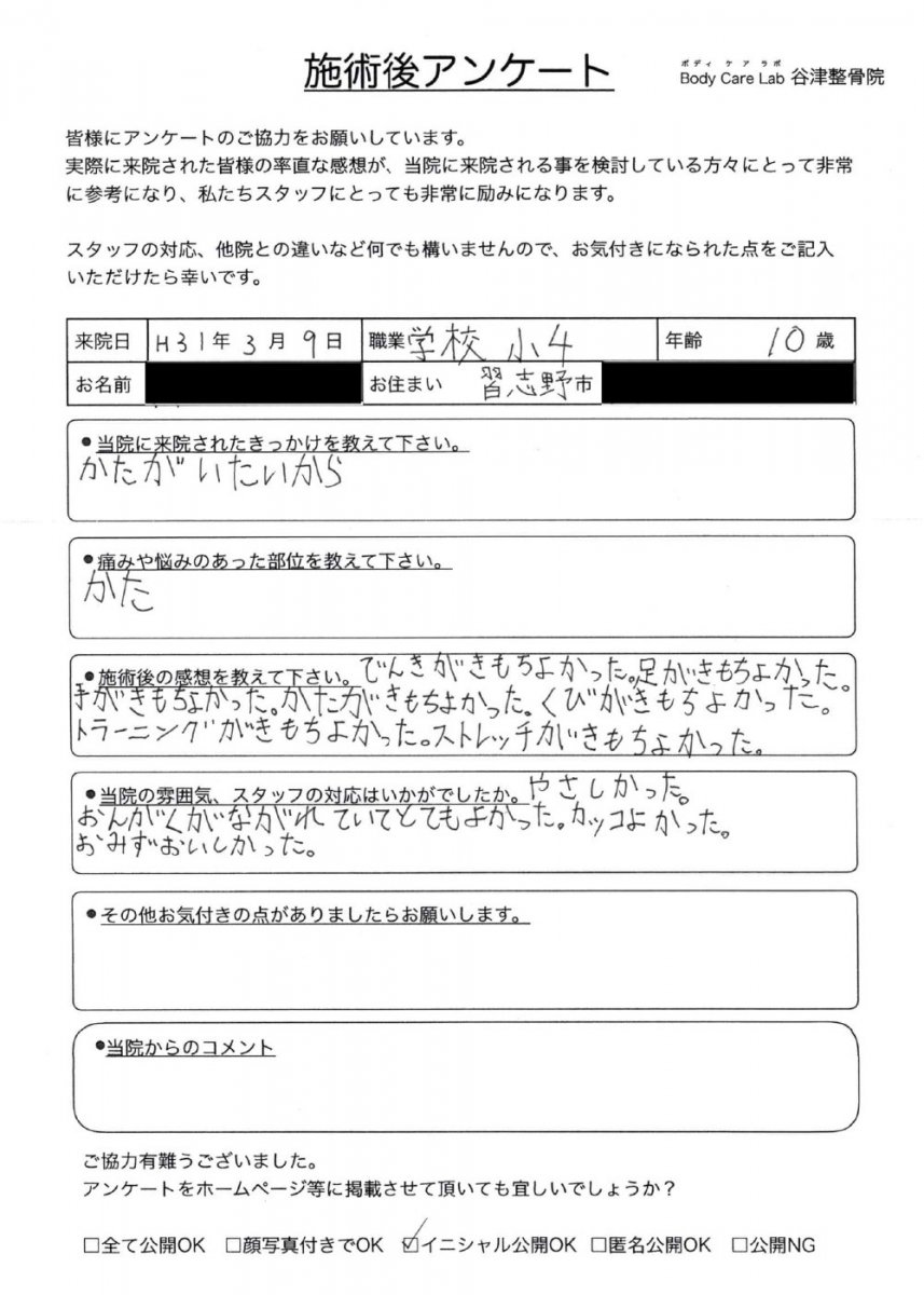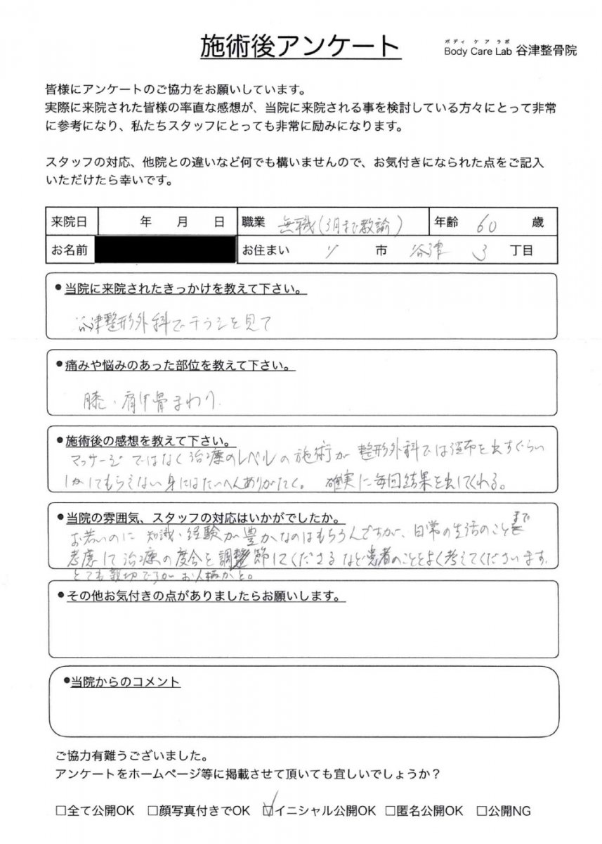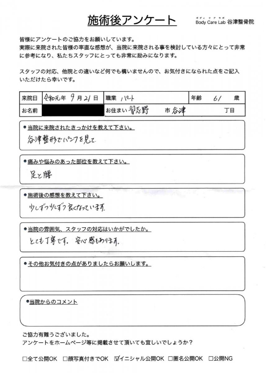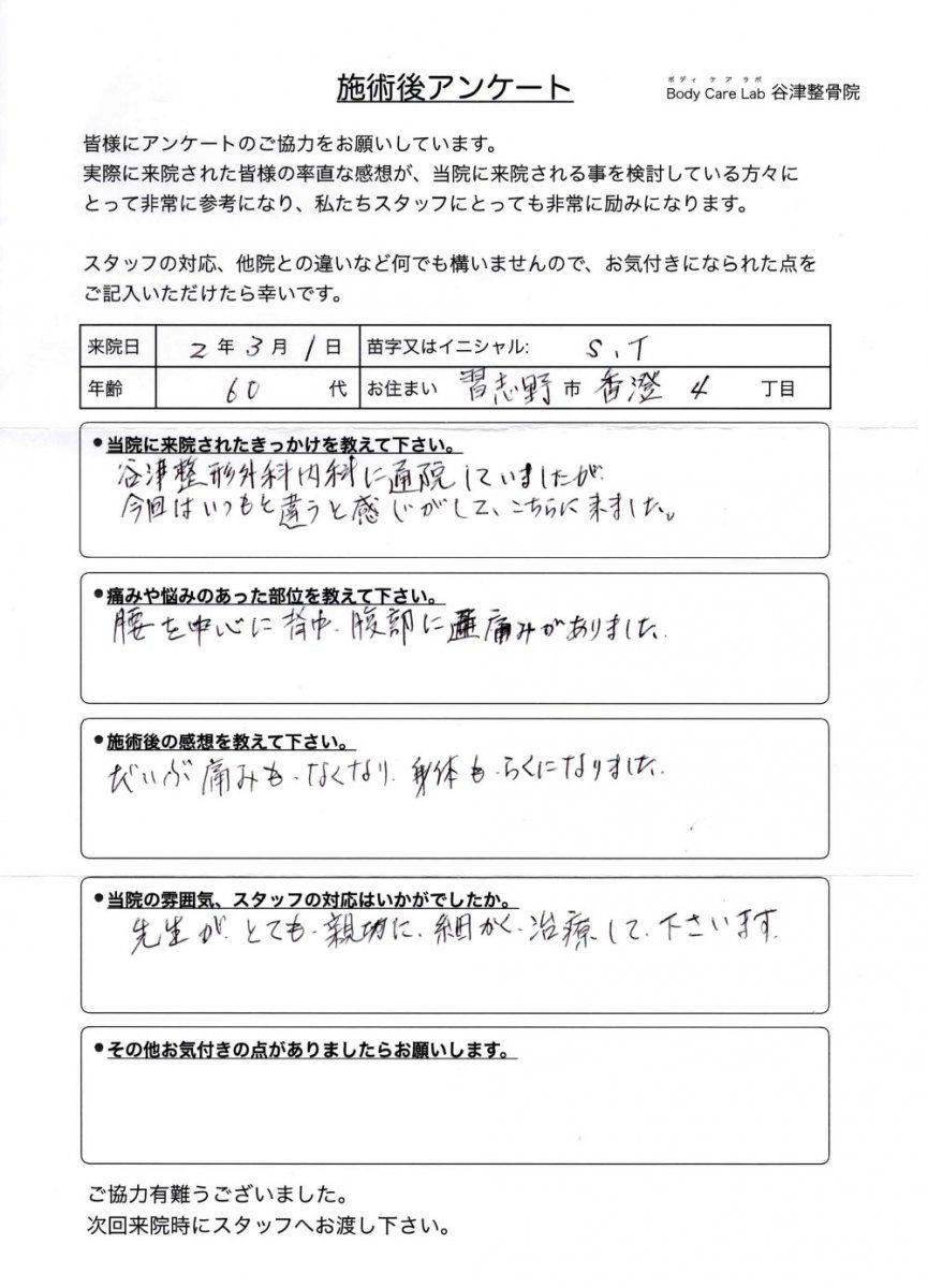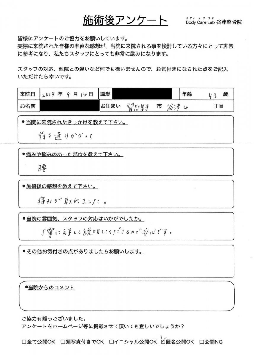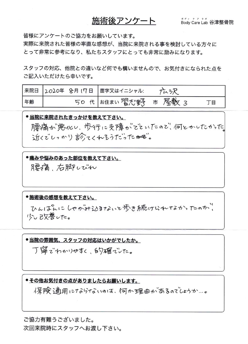 当院に来院されたきっかけを教えて下さい。腰痛が悪化し、歩行に支障がでていたので、何とかしたかった。近くでしっかり診てくれそうだった。 痛みや悩みのあった部位を教えてく下さい。腰痛、右脚しびれ 施術後の感想を教えて下さい。ひんぱんにしゃがみ込まないと歩き続けられなかったのが、少し改善した。 当院の雰囲気、スタッフの対応はいかがでしたか。丁寧でわかりやすく、的確でした。 その他お気付きの点がありましたらお願いします。保険適用にならないのは、何か理由があるのでしょうか、、、。 |
